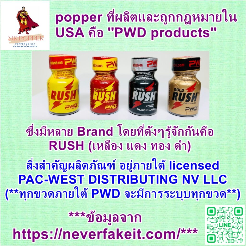 Popper แท้เกรด USA ที่เชื่อถือได้ จะต้องถูกผลิตและจัดจำหน่ายโดย PAC-WEST DISTRIBUTING NV LLC เท่านั้น ภายใต้ลิขสิทธิ์นี้ มีชื่อการค้าที่คุ้นเคย เช่น RUSH® (รัช ดำ แดง ทอง เหลือง), PWD® และแบรนด์อื่น ๆ