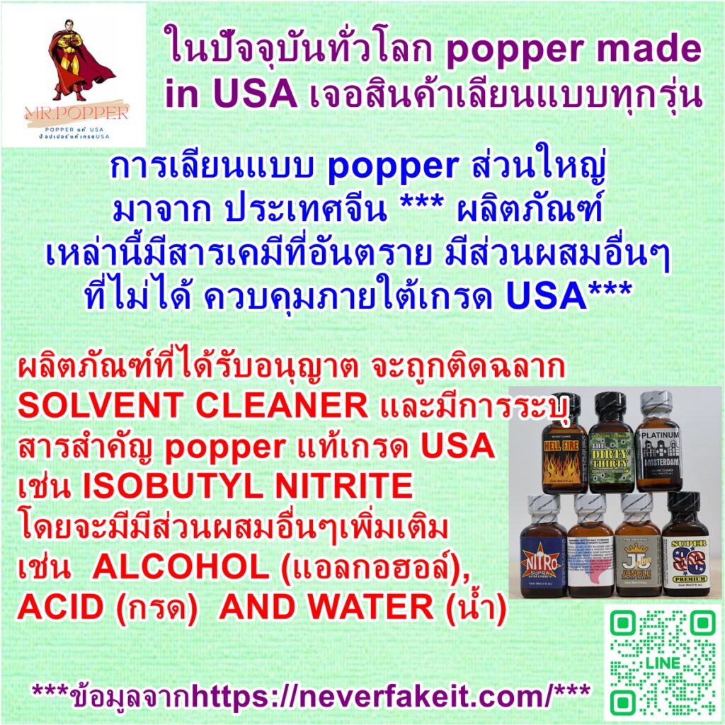 การเลือก Popper ป๊อปเปอร์แท้ เกรด USA เป็นเรื่องสำคัญมาก เพราะในตลาดปัจจุบันกว่า 97% ของสินค้าที่ขายในประเทศไทยเป็นของปลอมเกรดจีน ซึ่งอาจมีสารเคมีอันตรายและคุณภาพไม่คงที่